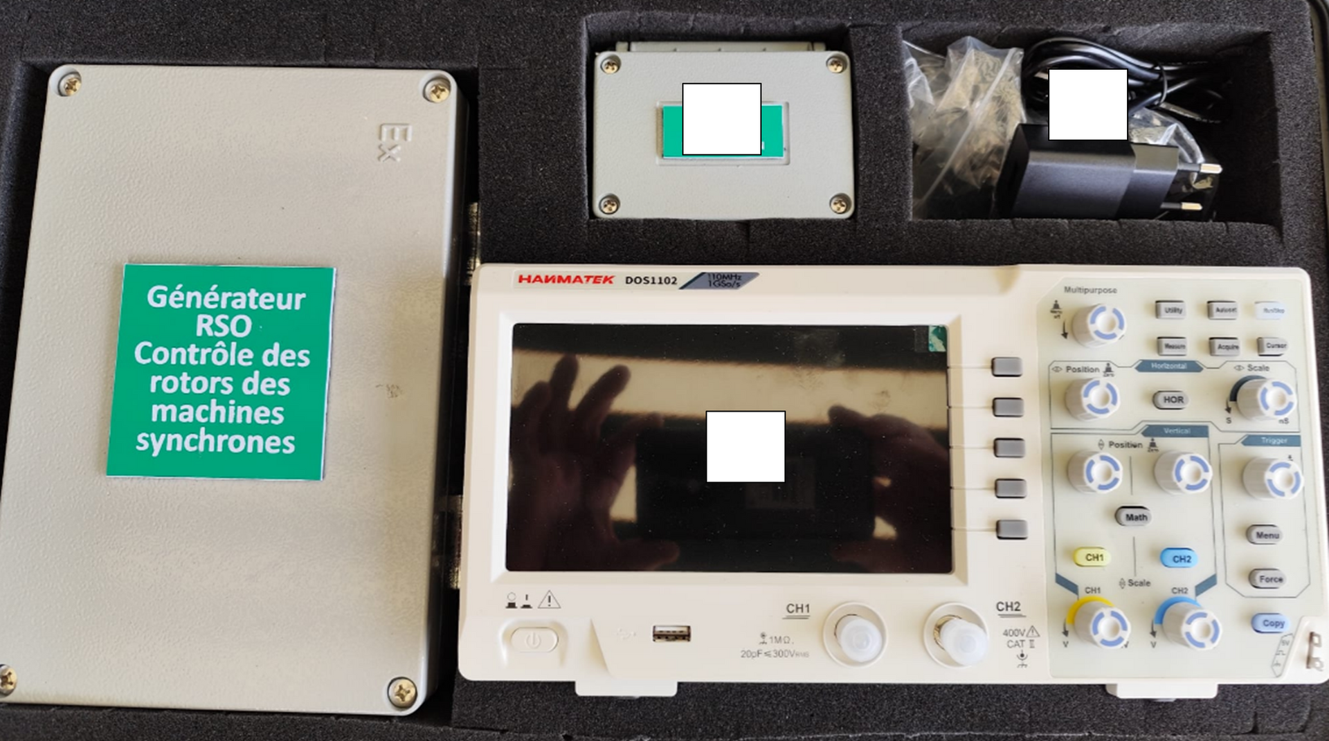 Overview of the main unit, the calibration box, the cables, and the oscilloscope.
